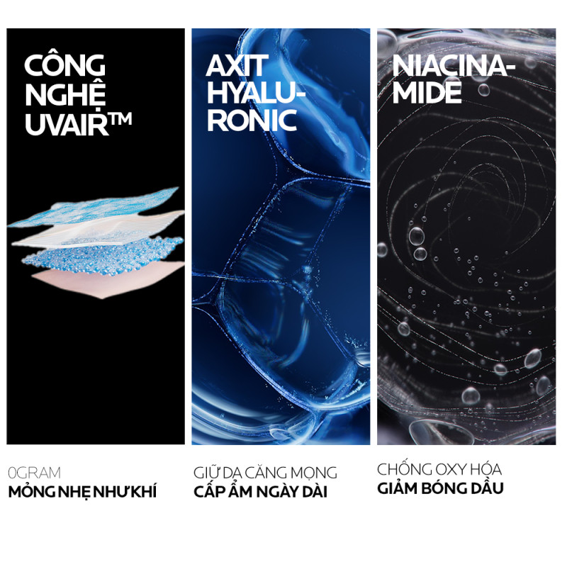 Chống nắng dạng serum siêu mỏng nhẹ La Roche-Posay Anthelios UVAir SPF50+ mang lại khả năng bảo vệ phổ rộng trước tia UVB và UVA cùng khả năng kiềm dầu vượt trội đến 16H và cấp ẩm đến 24H. Công thức sở hữu “Công nghệ 0G”, tạo cảm giác siêu nhẹ, không nhờn rít, không gây áp lực trên da. Sản phẩm chứa các thành phần dưỡng da như Hyaluronic Acid, Vitamin B3 và Vitamin E giúp nuôi dưỡng làn da khỏe hơn, tươi sáng hơn, vừa bảo vệ da hiệu quả vừa duy trì vẻ rạng rỡ mỗi ngày.