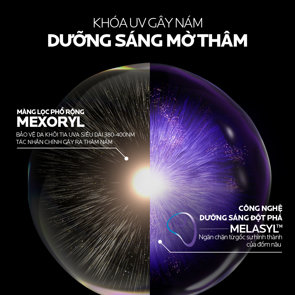 Mới! Sữa chống nắng dưỡng sáng Anthelios UVMune400 Anti-dark Spots SPF50+ giúp bảo vệ da phổ rộng, dưỡng sáng và cải thiện đốm nâu rõ rệt. Kết cấu lỏng nhẹ, vô hình trên da. • VÌ SAO BẠN SẼ THÍCH?Kết hợp hai công nghệ đột phá: Mexoryl 400 giúp bảo vệ da vượt trội khỏi tia UVA dài gây nám, và hoạt chất đột phá Melasyl giúp dưỡng sáng và ngăn chặn đốm nâu trước khi xuất hiện trên da. • THÔNG TIN SẢN PHẨM • LÀN DA PHÙ HỢPPhù hợp cho mọi làn da, đặc biệt da thâm sạm, có thâm mụn, thâm nám và da nhạy cảm • THÀNH PHẦN CHÍNH✔ Mexoryl 400: Bảo vệ da vượt trội khỏi tia UVB, UVA và đặc biệt là tia UVA siêu dài gây thâm nám, lão hóa da✔ Melasyl: Hoạt chất được nghiên cứu trong 18 năm giúp dưỡng sáng da, ngăn chặn đốm nâu từ gốc ✔ Netlock: Giúp kem chống nắng bền bỉ trên da và kháng nước, mồ hôi • ƯU ĐIỂM NỔI BẬT✔ Giúp dưỡng sáng da và cải thiện thâm mụn, thâm nám✔ Ngăn chặn sự hình thành đốm nâu do tia UVA dài✔ Bảo vệ da vượt trội và bền bỉ trên da cả ngày dài✔ Kết cấu lỏng nhẹ, thấm nhanh, vô hình trên da✔ Kháng nước, mồ hôi và cát – Phù hợp sử dụng hoạt động ngoài trời và dưới nước • HƯỚNG DẪN SỬ DỤNGSử dụng buổi sáng sau các bước chăm sóc da. Thoa một lượng vừa đủ trên toàn mặt và cổ. • THÔNG TIN THƯƠNG HIỆULa Roche-Posay là nhãn hàng dược mỹ phẩm đến từ Pháp trực thuộc tập đoàn L’Oreal đã hoạt động được hơn 30 năm, phối hợp nghiên cứu với các bác sĩ da liễu trên toàn thế giới cho ra đời các sản phẩm dưỡng da hướng đến thị trường sản phẩm dành cho da nhạy cảm, ngoài ra còn có dòng sản phẩm dành cho trẻ em. Thành phần nổi bật xuất hiện trong các sản phẩm của La Roche-Posay (LRP) là nước suối khoáng – thermal spring water. Tất cả những sản phẩm thuộc La Roche Posay đều được thử nghiệm lâm sàng và đánh giá khách quan từ bệnh viện Saint Jacques-Toulouse. Quy trình bào chế của sản phẩm cũng rất nghiêm ngặt mang lại cho người sử dụng vẻ đẹp tự nhiên và rất an toàn. HSD: 03 năm kể từ NSXNSX: Xem trên bao bìXuất xứ thương hiệu: PhápNơi sản xuất: Pháp