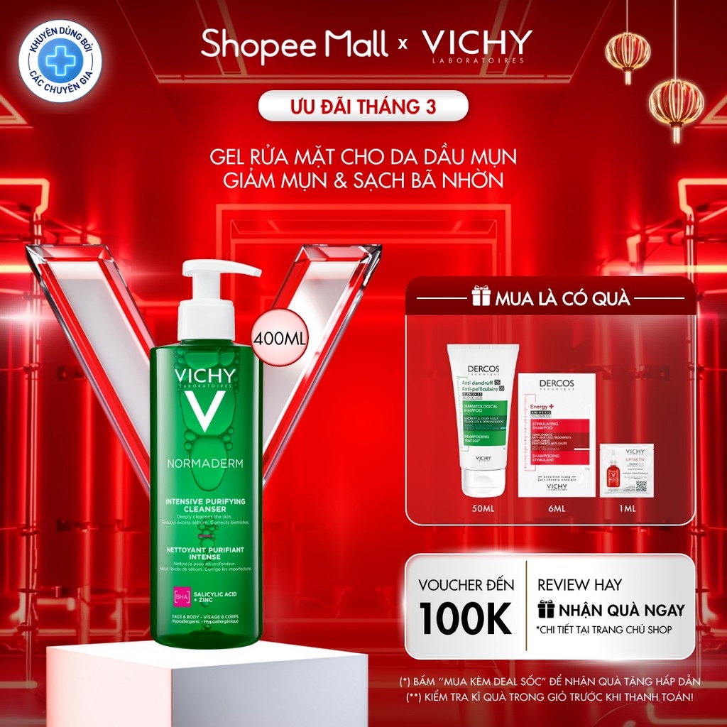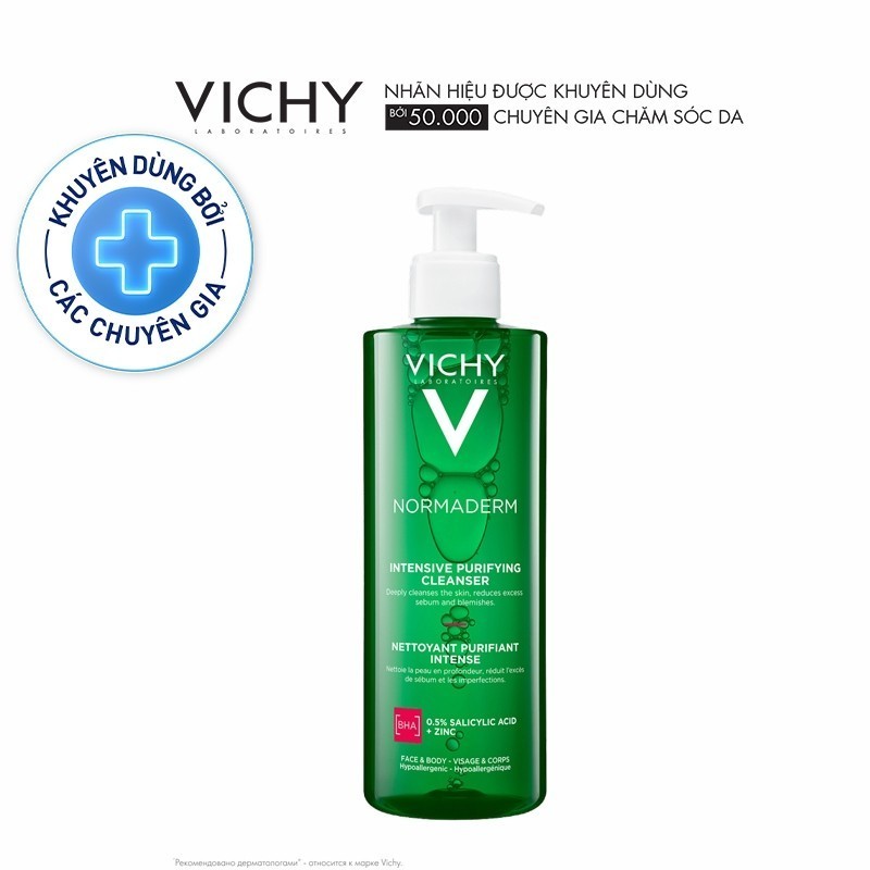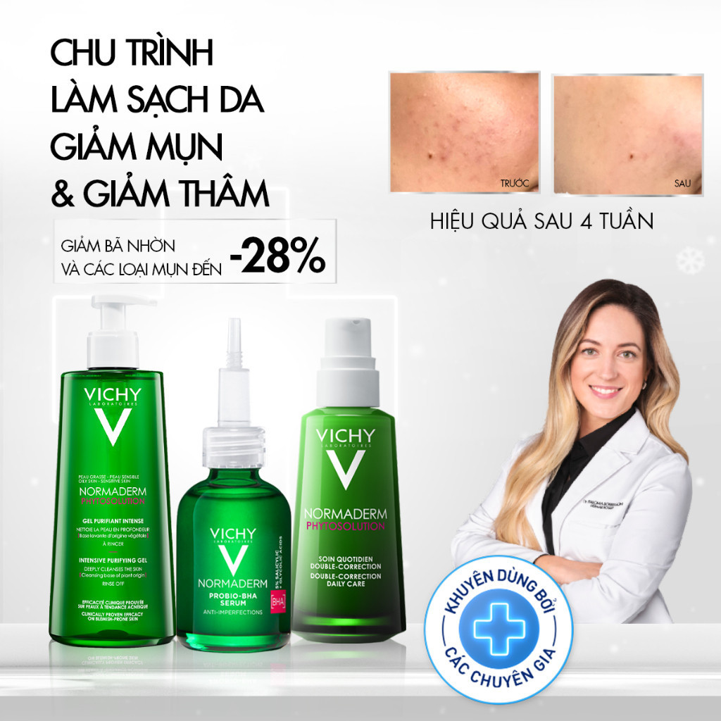 • VÌ SAO BẠN SẼ THÍCH?Sữa rửa mặt dạng gel giúp làm sạch sâu và giảm bã nhờn trên da Normaderm Phytosolution Intensive Purifying Gel 400ml là sản phẩm làm sạch da tác động vào sâu bên trong lỗ chân lông, giúp thông thoáng và làm sạch da. Ngoài ra, Normaderm Phytosolution Intensive Purifying Gel còn cung cấp một số dưỡng chất giúp thu nhỏ lỗ chân lông, cấp ẩm cần thiết cho da. THÔNG TIN SẢN PHẨMLoại sản phẩm: Sữa rửa mặt dạng gel giúp làm sạch dâu, giảm bã nhờn trên da Loại da phù hợp: Mọi loại da, đặc biệt là da mụn, da nhạy cảm. Độ an toàn- Không parapen, không alcohol- Được kiểm nghiệm da liễu- Không gây kích ứng, không gây khô da- An toàn cho da nhạy cảm Thành phần:- Zinc oxide: loại bỏ vi khuẩn có hại, giảm mẫn đỏ trên da- Copper: điều tiết bã nhờn- Salicylic acid: thanh lọc da, giảm dày sừng nang lông tuyến bã- Bifidus Probiotics: Củng cố hàng rào bảo vệ da Công dụng- Làm sạch sâu, giảm bã nhờn, không gây tổn hại đến da- Không làm khô da- Kiểm soát dầu, ngăn mụn tái phát- Giảm mụn đầu đen, mụn ẩn, mụn trứng cá- Giảm mụn mẫn đỏ- Thu nhỏ kích thước lỗ chân lông Hướng dẫn sử dụng- Sử dụng sáng và tối. Lấy một lượng sản phẩm vừa đủ rồi nhẹ nhàng massage mặt theo hình tròn, hướng lên trên.- Rửa sạch bằng nước lạnh hoặc nước ấm- Để có kết quả tốt nhất, hãy dùng kèm kem dưỡng ẩm Normaderm – Phytosolution Double-Correction Daily Care. THÔNG TIN THƯƠNG HIỆUVichy là thương hiệu nổi tiếng của Pháp được thành lập vào năm 1931 tại thành phố cùng tên Vichy bởi bác sĩ da liễu Haller và nhà kinh doanh Guerin. Với nhiều năm kinh nghiệm, viện nghiên cứu Vichy đã sáng tạo ra nhiều phương thức mới và hiệu quả để chăm sóc sức khỏe làn da. Tất cả sản phẩm Vichy được kiểm nghiệm một cách toàn diện và khắt khe dưới sự giám sát của chuyên gia da liễu về độ an toàn và dịu nhẹ cho da, đặc biệt đối với làn da nhạy cảm. Ngoài ra, các sản phẩm của Vichy đã được chứng minh không gây dị ứng, không gây mụn, chứa nước khoáng Vichy giàu khoáng chất có tác dụng củng cố và tăng cường tái tạo da. HSD: 03 năm kể từ NSXNSX xem trên bao bì sản phẩmXuất xứ thương hiệu: PhápSản xuất tại: PhápThành phần chi tiết xem trên bao bì sản phẩm • ƯU ĐIỂM NỔI BẬT- Làm sạch sâu, giảm bã nhờn, không gây tổn hại đến da- Không làm khô da- Kiểm soát dầu, ngăn mụn tái phát- Giảm mụn đầu đen, mụn ẩn, mụn trứng cá – Giảm mụn sưng v.iêm- Thu nhỏ kích thước lỗ chân lông • HIỆU QUẢ SỬ DỤNG- Làm sạch sâu, giảm bã nhờn- Giảm mụn đầu đen, mụn ẩn, mụn trứng cá – Giảm mụn sưng viêm • HƯỚNG DẪN SỬ DỤNG- Sử dụng sáng và tối. Lấy một lượng sản phẩm vừa đủ rồi nhẹ nhàng massage mặt theo hình tròn, hướng lên trên. – Rửa sạch bằng nước lạnh hoặc nước ấm- Để có kết quả tốt nhất, hãy dùng kèm kem dưỡng ẩm Normaderm Phytosolution Double-Correction Daily Care. • THÔNG TIN THƯƠNG HIỆU